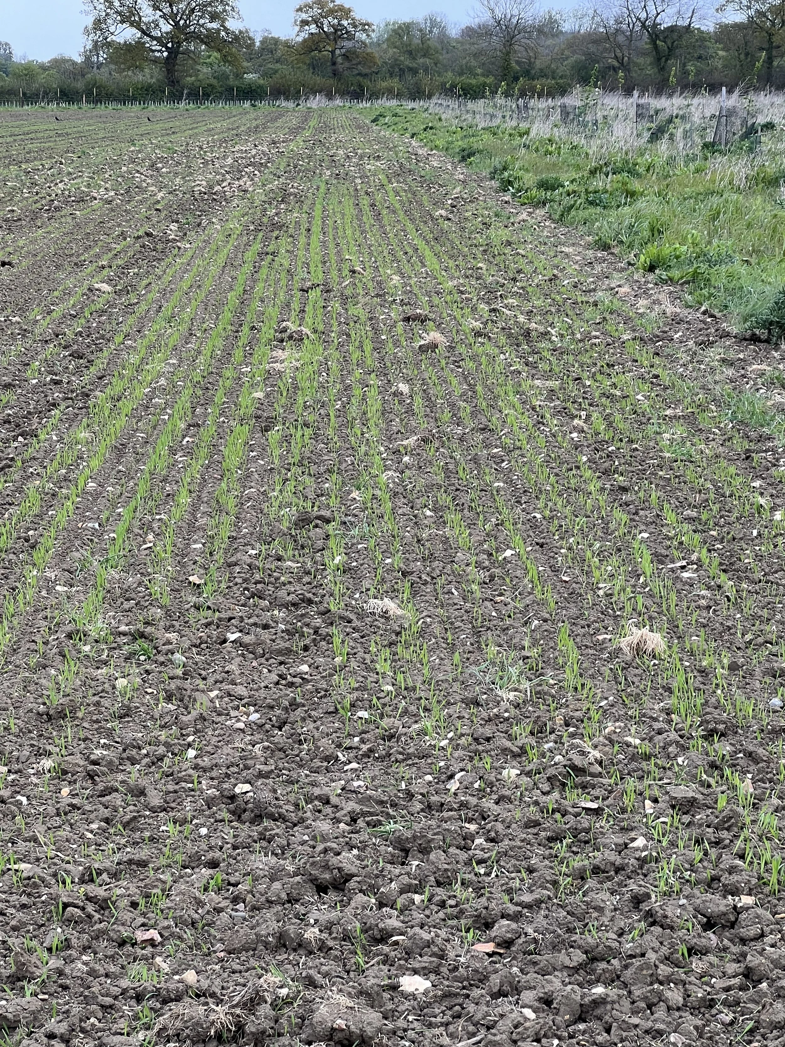 Up on Wood Field, in two of alleys between the fruit trees we have at long last planted our first commercial crop which is oats. The plan had been last autumn to be sowing a by crop of winter wheat and beans but the storms and heavy rain put pay to that. Therefore it has been great to get the oats in and to see them begin to germinate.